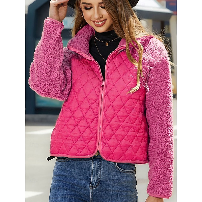 Women's Fleece Jacket Warm Zipper Fashion Modern Casual Plain Work Daily Wear Zipper Short Stand Collar Loose Fit Long Sleeve Outerwear Black White Red Fall Winter 15