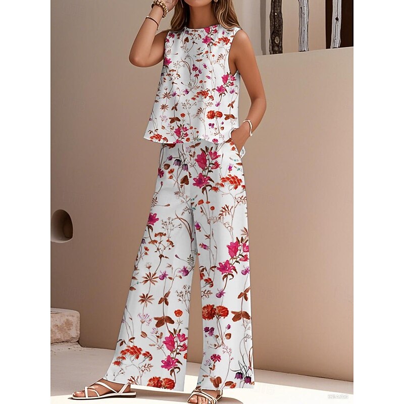 HOT ! Women's Elegant Fashion Streetwear Two Piece Sets Blouse Vest Pants Trousers Sleeveless Crew Neck Outdoor Work Casual Floral Print Vacation Daily Holiday White Navy Blue Blue Summer Regular Fit