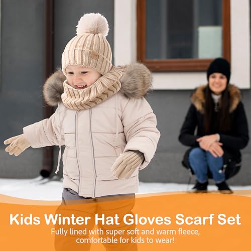 Children Winter Beanie Hat Scart Gloves Set, Kids Fleece Lined Knitted Woollen Pompom Hat for Boys Girls Toddler 3-9 Years 4