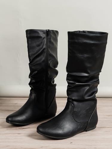 Women's Slouchy Knee High Boots Pull On Flat Boots with Side Zipper Fall Winter Western Cowgirl Booties for Women Soft Faux Leather Round Toe Low Heels Combat Mid Calf Tall Dress Boots 6