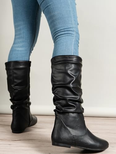 Women's Slouchy Knee High Boots Pull On Flat Boots with Side Zipper Fall Winter Western Cowgirl Booties for Women Soft Faux Leather Round Toe Low Heels Combat Mid Calf Tall Dress Boots 5
