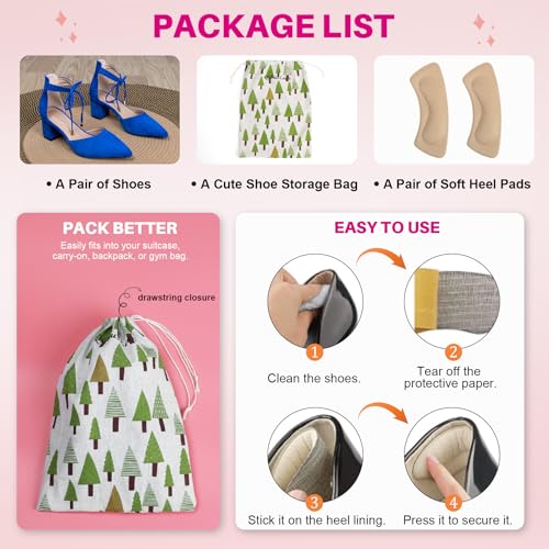 • PACKAGE LIST: A pair of ankle strappy heels, along with a cute shoe storage bag and a pair of soft heel pads. The cute storage bag is convenient for you to store shoes or other items when traveling; The soft heel pad provides a backup solution for any issues you may encounter while wearing shoes.