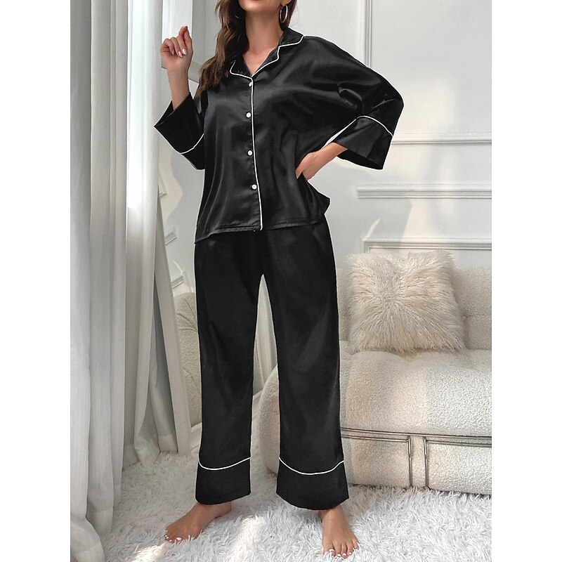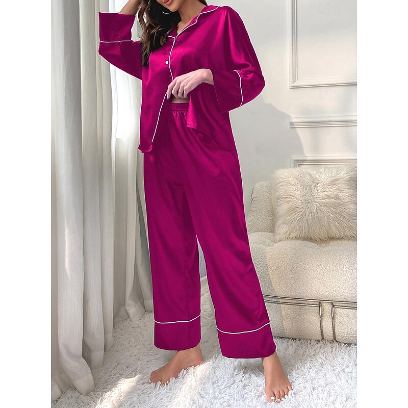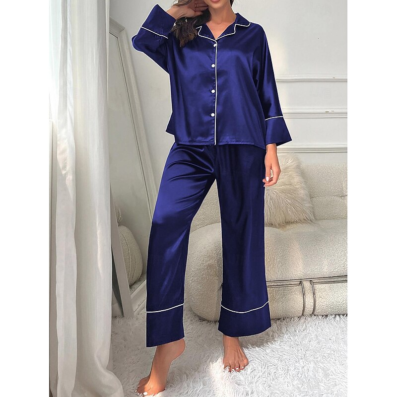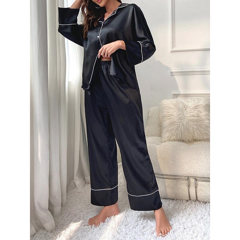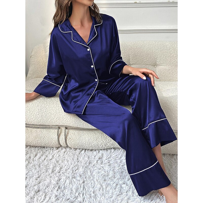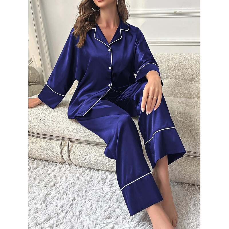 The pajama set features a timeless silhouette, with a button-up front and notched collar, accented by contrasting piping for classic sophistication. The top offers a relaxed fit with long sleeves, giving you freedom of movement and comfort throughout wear. The matching pants boast a straight-leg design with an elastic waistband for a secure yet comfortable fit.
