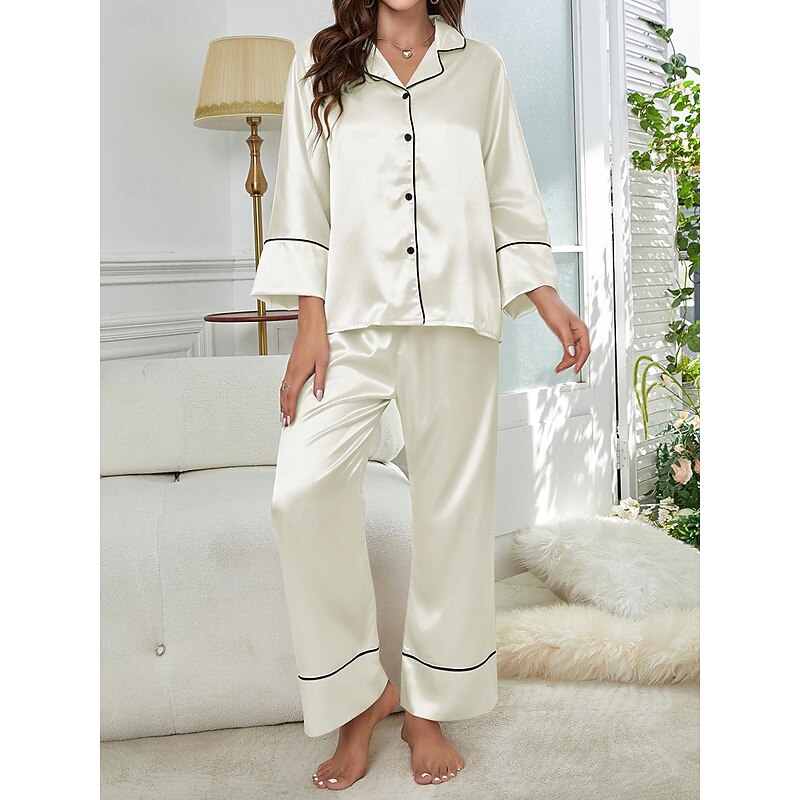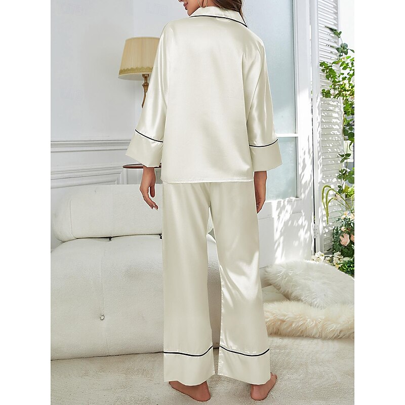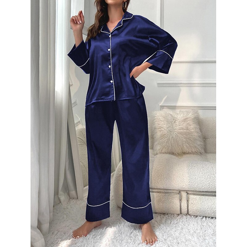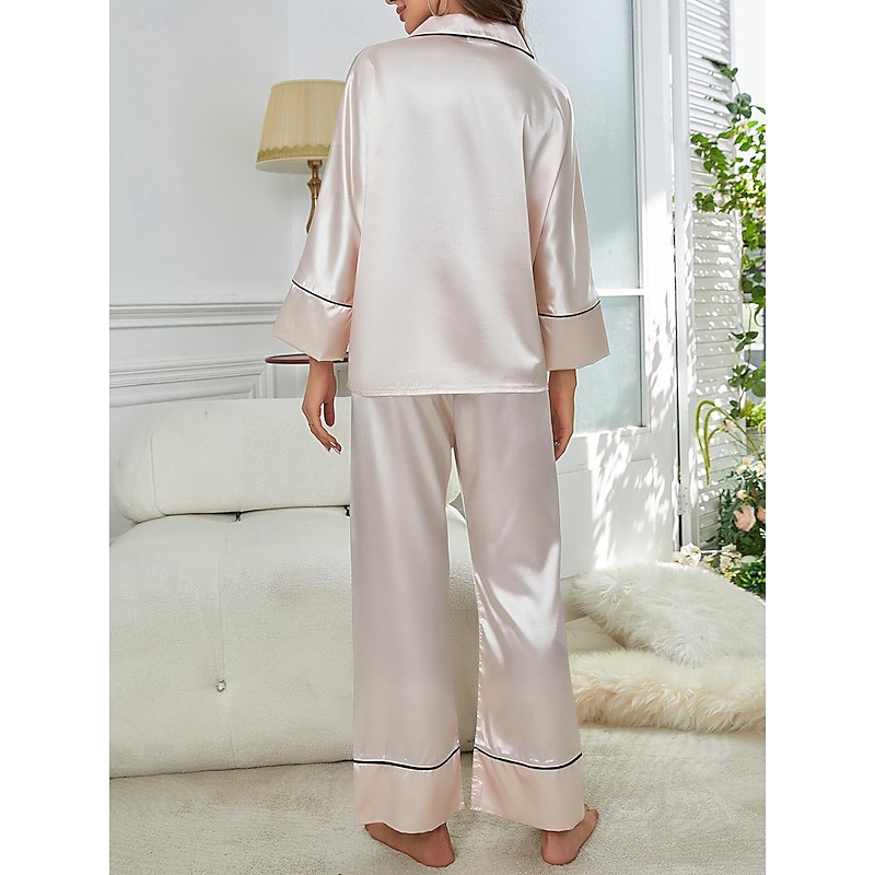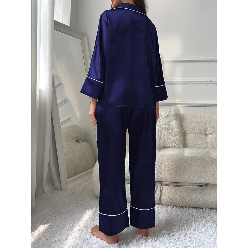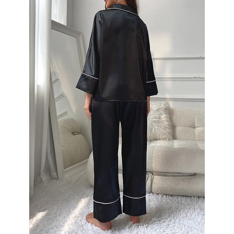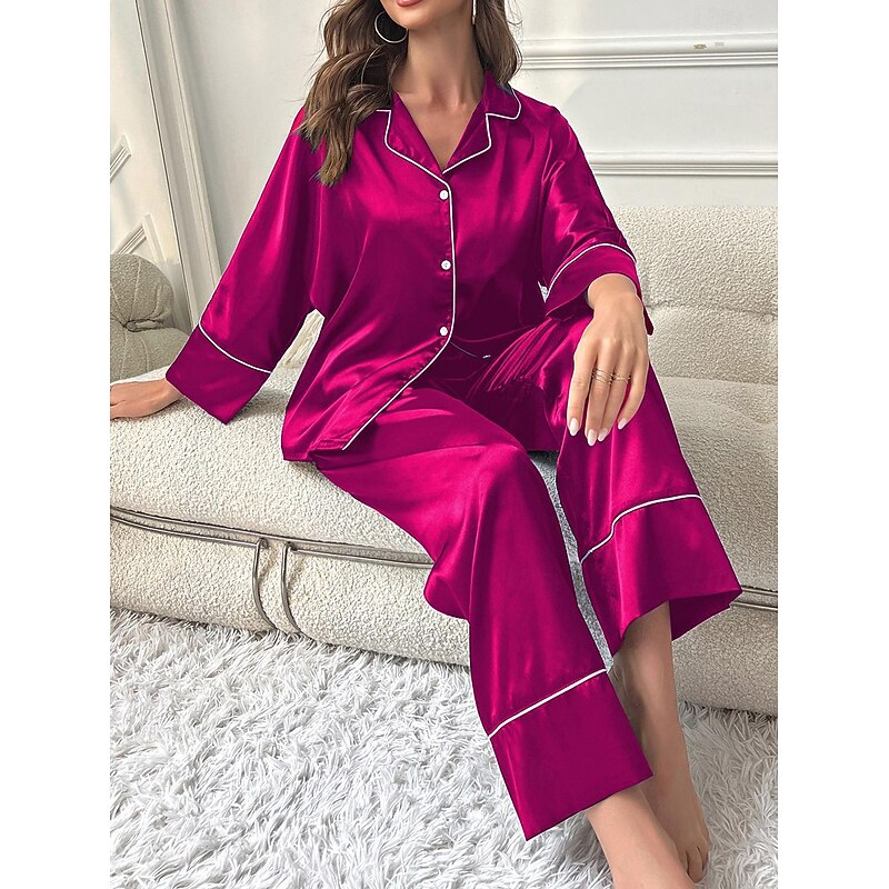 The pajama set features a timeless silhouette, with a button-up front and notched collar, accented by contrasting piping for classic sophistication. The top offers a relaxed fit with long sleeves, giving you freedom of movement and comfort throughout wear. The matching pants boast a straight-leg design with an elastic waistband for a secure yet comfortable fit.