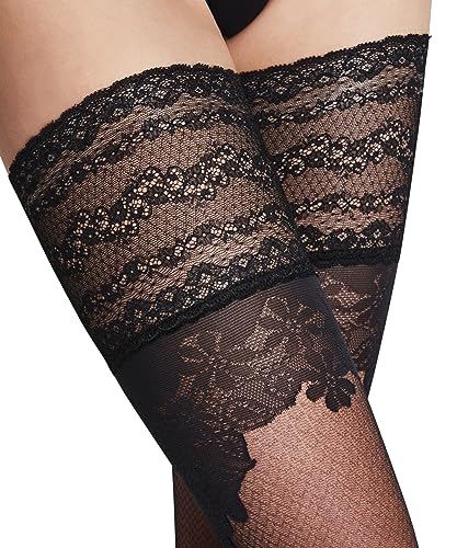 HOT ! FALKE Women's Ceremonial 20 Denier Thigh Highs, Floral Lace Band with Non Slip Grip, Fine Sheer Transparent, Nylon, Black (Black 3009), L, 1 Pair