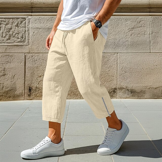 Men's Linen Pants Trousers Summer Pants Baggy Pants Beach Pants Zipper Elastic Waist Drawstring Plain Comfort Breathable Ankle-Length Casual Daily Holiday Vacation Fashion Black White Inelastic 7