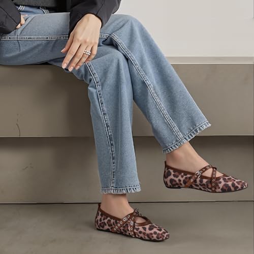 VIMISAOI Leopard Flats for Women Mesh Ballet Flats Shoes for Women Fishnet Buckle Round Toe Mary Jane Ballerina Shoes Dress Shoes 6