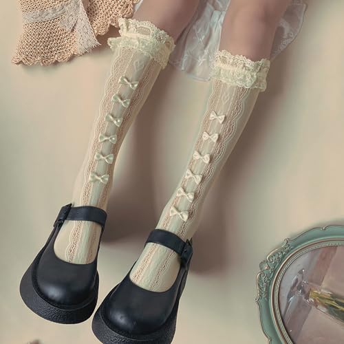 HOT ! Triplewood Over the Calf Knee High Socks Y2K Socks with Bowknot Sheer Mesh Fishnet Stockings Sheer Tights