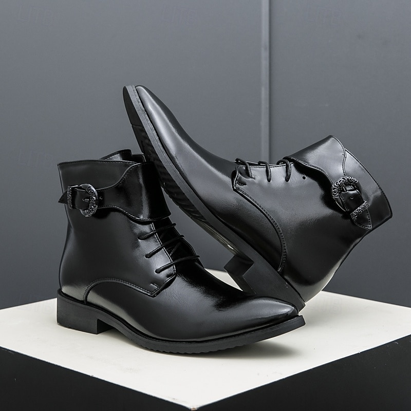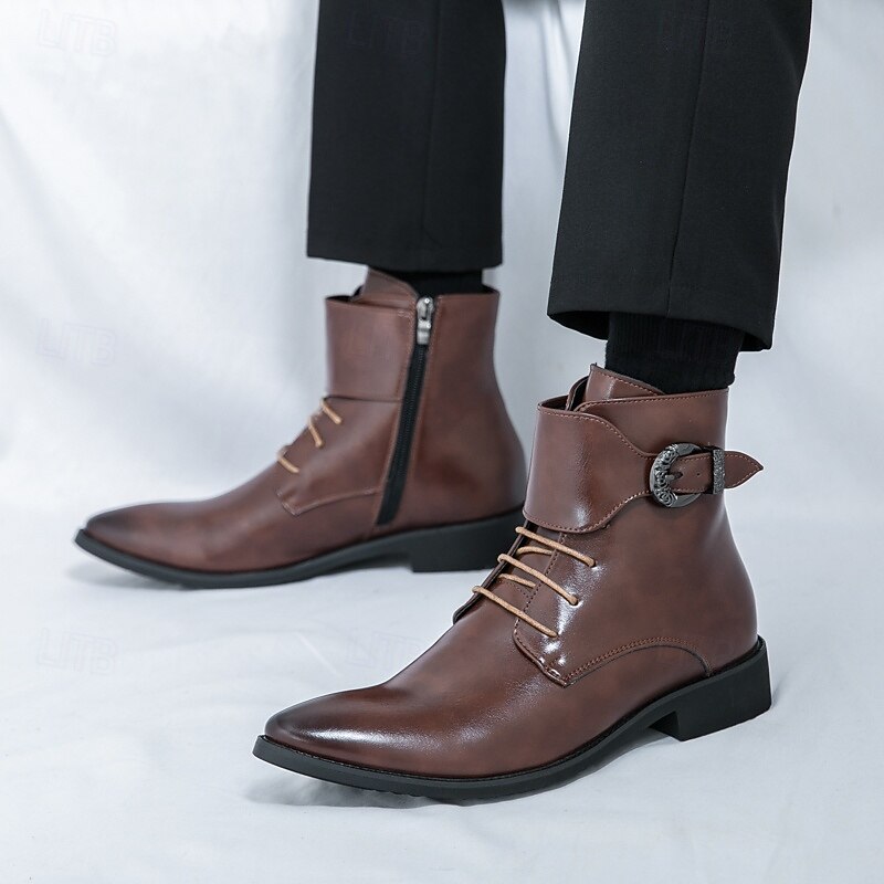 HOT ! Men's Brown Faux Leather Ankle Boots with Buckle and Lace-Up Design, Stylish Footwear for Business Casual, Smart Casual and Evening Events