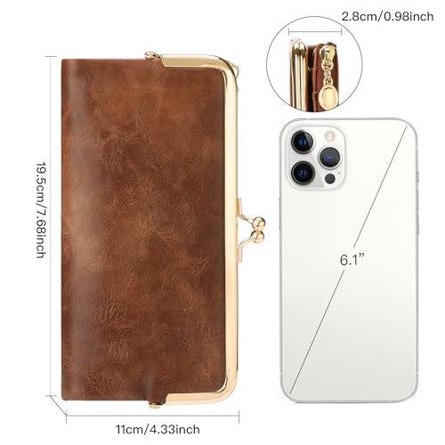 GOIACII Womens Wallet Ladies Vintage Billfold Compact Card Holder Long Zip Clutch Purse with Kiss Lock Brown 1