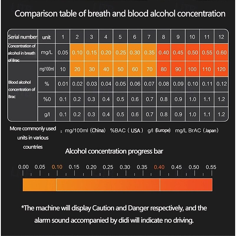 Highlights - Quickly and accurately test your BAC in just 5 seconds with results you can trust. - Sound warning alarm system alerts you when your BAC is higher than 0.050% or 0.500‰. - High contrast LCD display is clear and easy to read and automatically saves default units in case of power failure. - Long-lasting AAA battery allows for over 200 uses and can be easily replaced or recycled. - Simple one-button operation and portable, ergonomic design with 5 reusable mouthpieces make it easy to use anywhere.