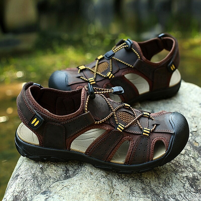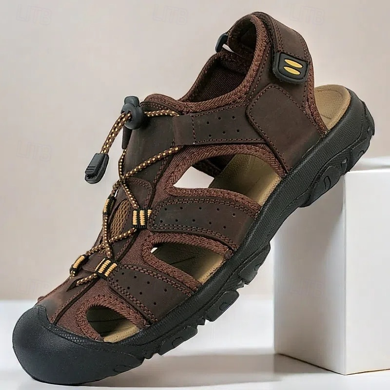 HOT ! Men's Brown Faux Leather Hiking Sandals - Closed-Toe, Breathable, Adjustable Drawstring, Anti-Slip Sole, Durable Outdoor Footwear for Summer Trekking and Camping