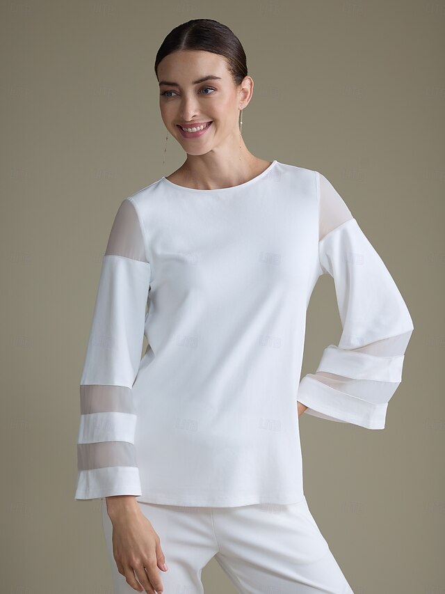 HOT ! Women's Elegant White Modal Top Fitted with Sheer Chiffon Sleeves Stylish Lightweight Comfortable Daily Work Evening Fall
