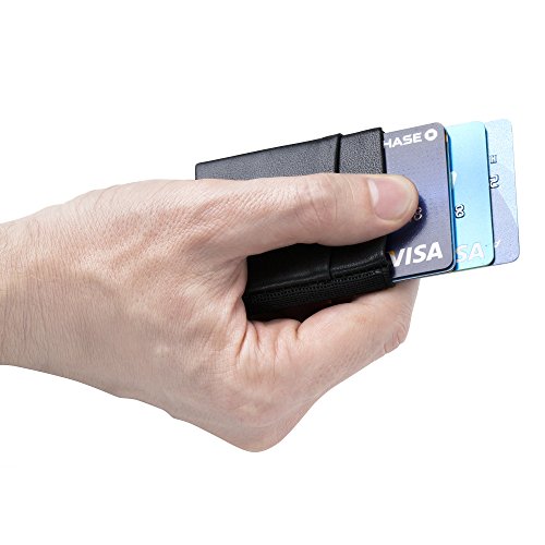 Brand: AtzilooseColor: BlackMaterial: LeatherStyle: MinimalistPattern: SolidFRONT POCKET SLIM AND SMART WALLETS: This minimalist dream wallet was ingeniously designed to provide the utmost in style, security, comfort, and convenience. It's smaller than an actual credit card, yet this cool credit card sleeve can securely carry up to 14 cards, including a driver's license, work ID or business cards.NON RFID BLOCKING!! GENUINE LEATHER WALLET: This thin wallet is composed of a velvety, durable leather front and a thick elastic back creating a tight, but flexible, bond. The flat front pocket on this slim card sleeve can be used for storing cash, change, coin holder, coins or a key.FASHION FORWARD CREDIT CARD HOLDER: Fashionably designed with flat front and skinny trousers in mind, this super slim wallet will easily fit into any front or back pocket. It's so thin, you will hardly feel it! Great for jean pocket and jeans. Ridge wallet credit card protector.FATHER AND DAD GIFTS: Christmas Gifts stocking stuffers. Perfect gifts for dad are hard to find. Our items make the best dad gifts. Also makes a great birthday present, Valentine's gift, Christmas present, Father's Day present, graduation present, anniversary present or just because! Dad gifts from daughter are especially treasured, give dad something he will love!CUSTOMER SATISFACTION: If you have an questions, comments, or issues with this item, please let us know, we stand behind our products and want our customers to enjoy them as much as we do! Perfect for everyday use. premium materials and excellent craftsmanship ensure long-lasting durability.
