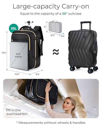 • Spacious and Carry-On Friendly: Roller backpack with an impressive 33-liter capacity—equivalent to a 20-inch suitcase—this Cary on backpack fits perfectly in airplane overhead compartments. It’s ideal for short trips or business travel, accommodating all your essentials while ensuring hassle-free boarding