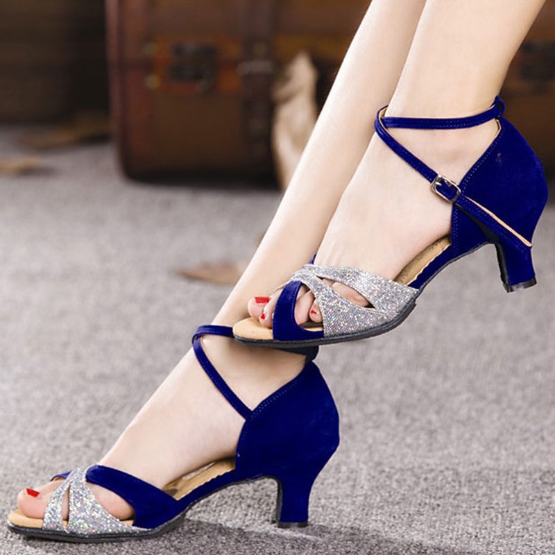 Highlights [Fabric and Design] : Crafted from premium PU leather and suede, these Women's Latin Dance Shoes feature an elegant blend of textures with dazzling glitter embellishments. This combination delivers a striking and glamorous appearance, perfect for catching attention on the dance floor. [Chic and Comfortable Style] : Designed with a stylish open-toe and sophisticated cross-strap details, these shoes offer a modern twist on traditional dance footwear. The comfortable Cuban heel, approximately 2.17 inches high, ensures graceful movements while providing stability and support during practice or performances. [Unique Design Highlights] : Featuring a secure buckle closure, these sandals allow for an adjustable fit, enhancing comfort and confidence. The metallic silver accents, combined with the royal blue hue, add an extra layer of sophistication suitable for indoor parties and special events. [Versatile Occasions] : Ideal for ballroom dancing, salsa, Latin, and line dance practices, these shoes are your go-to option for various occasions, whether it's a cozy indoor session or a lively cha-cha performance. They seamlessly blend style and functionality for any dance enthusiast. [Available Sizes] : These dance shoes are available in a wide range of sizes, from US4 to US10.5, accommodating different foot measurements and ensuring a perfect fit for every dancer.