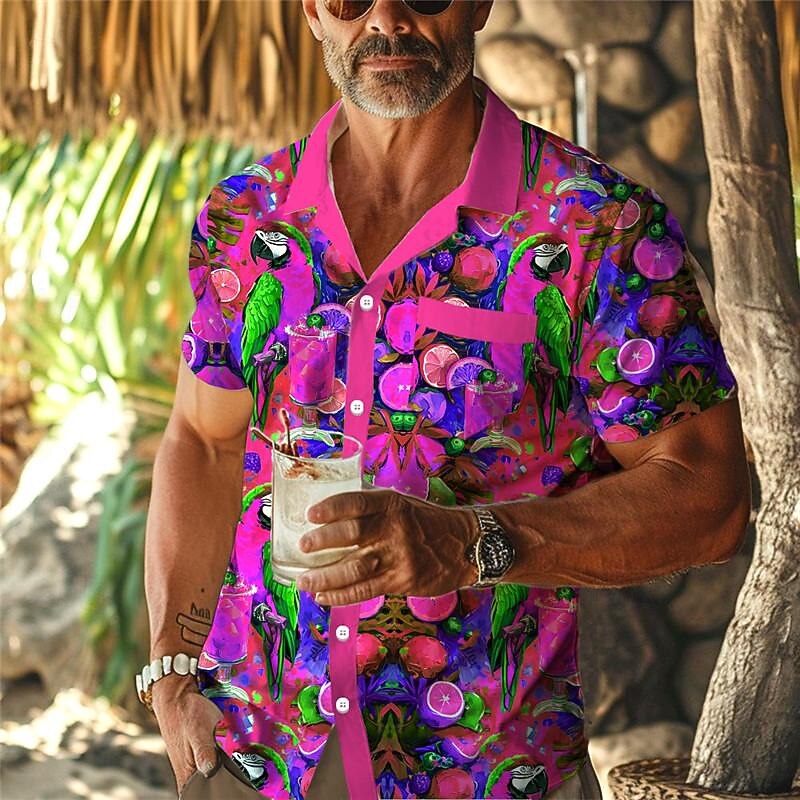 HOT ! Men's Fruit Parrot Shirt Summer Hawaiian Shirt Aloha Shirt Short Sleeve Shirt Cuban Collar Hawaiian Casual Outdoor Street Casual Daily Yellow Pink Green S M L