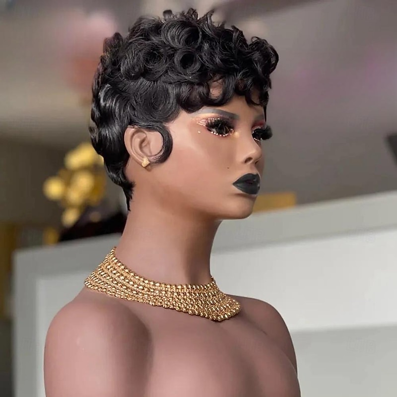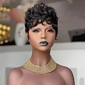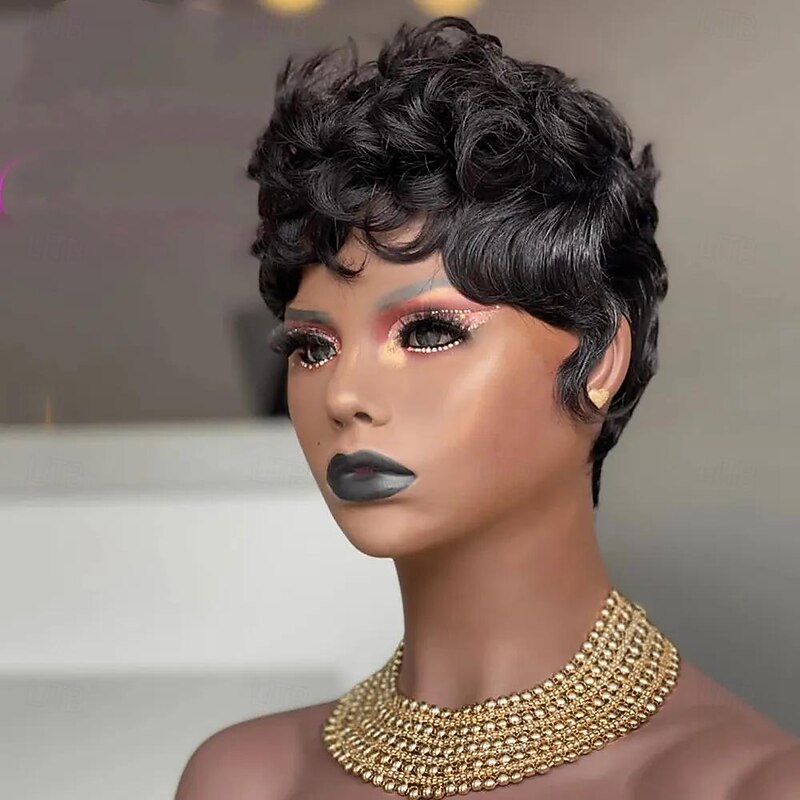 More information about Curly Short Pixie Cut Remy Human Hair Wig Ready To Wear Black Color Water Wave Bob Full Machine Made Wigs With Bangs