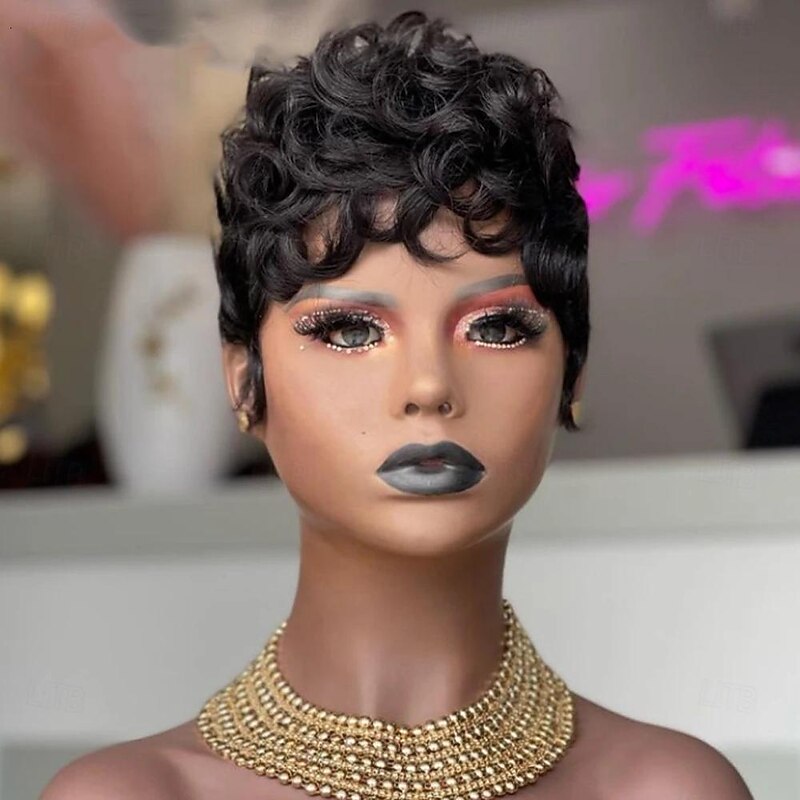 HOT ! Curly Short Pixie Cut Remy Human Hair Wig Ready To Wear Black Color Water Wave Bob Full Machine Made Wigs With Bangs