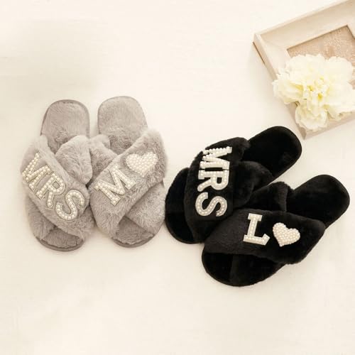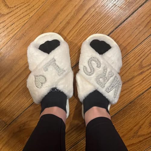 HOT ! shiguangji Bridal Mrs Wedding slippers, Custom Mrs Fluffy Slippers with pearls letters, Bridal Shower Gifts, Gifts For Her