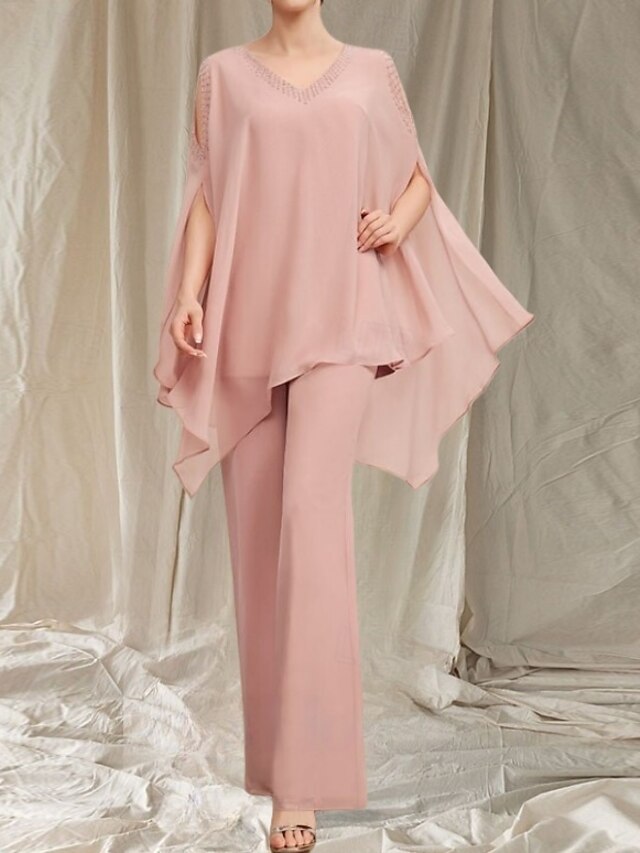 HOT ! Pantsuit Mother of the Bride Dress Wedding Guest Elegant V Neck Floor Length Chiffon Long Sleeve with Beading Cascading Ruffles