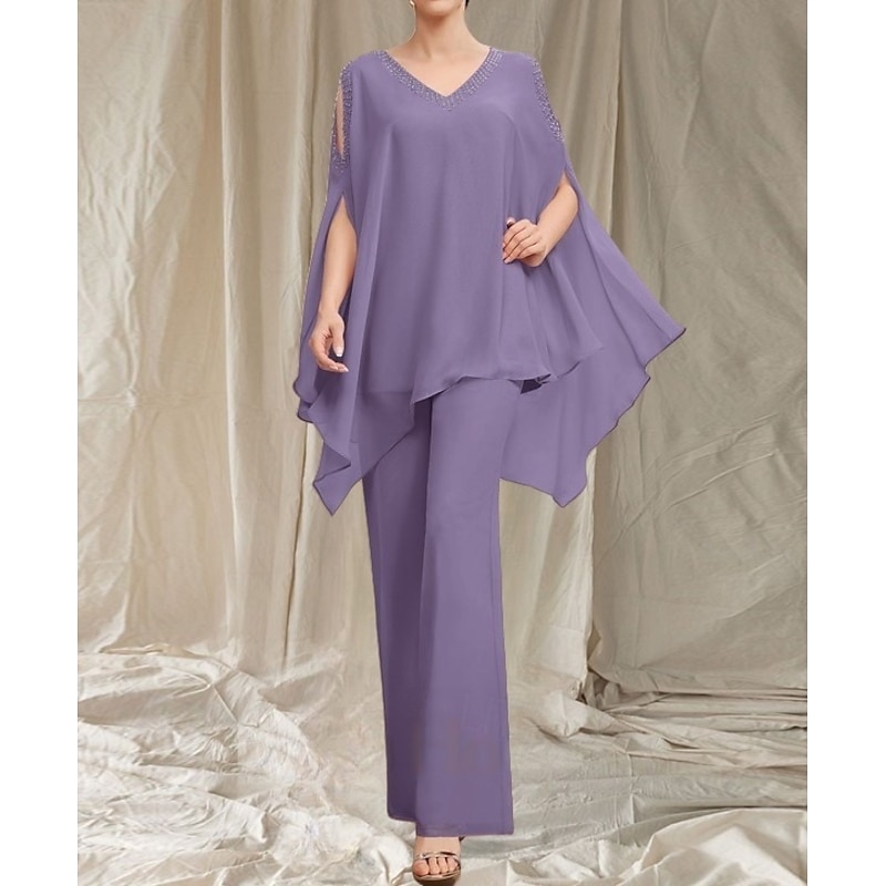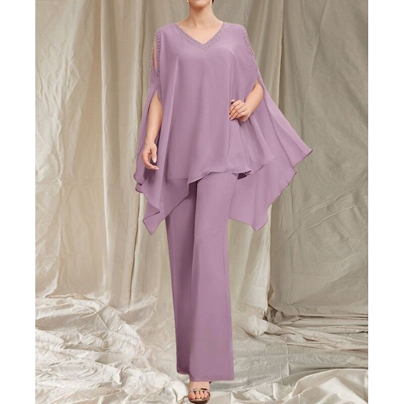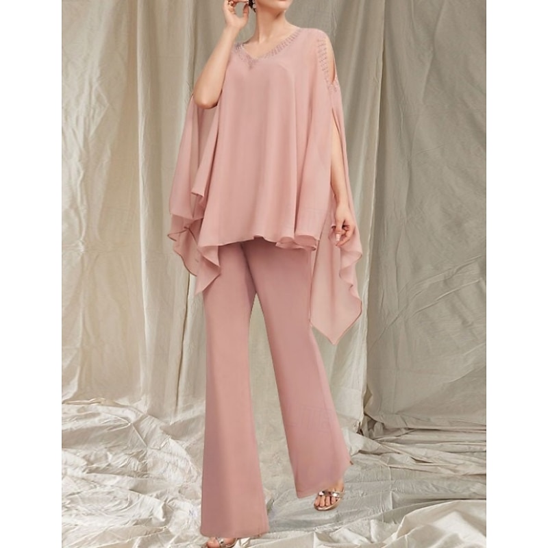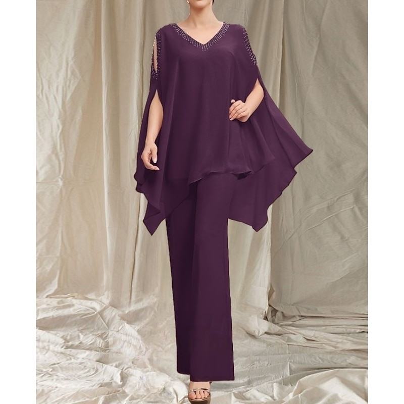 More information about Pantsuit Mother of the Bride Dress Wedding Guest Elegant V Neck Floor Length Chiffon Long Sleeve with Beading Cascading Ruffles