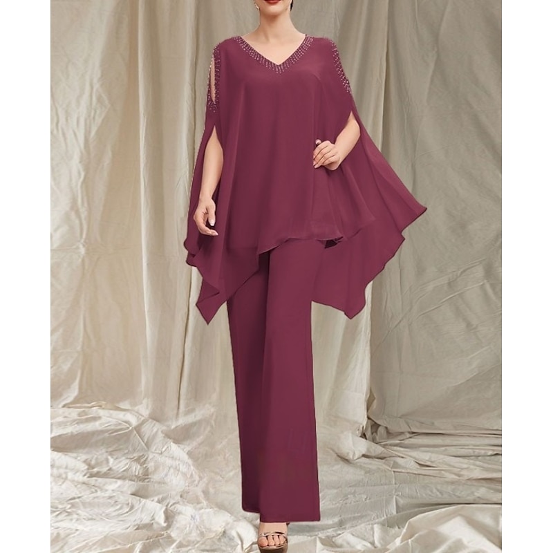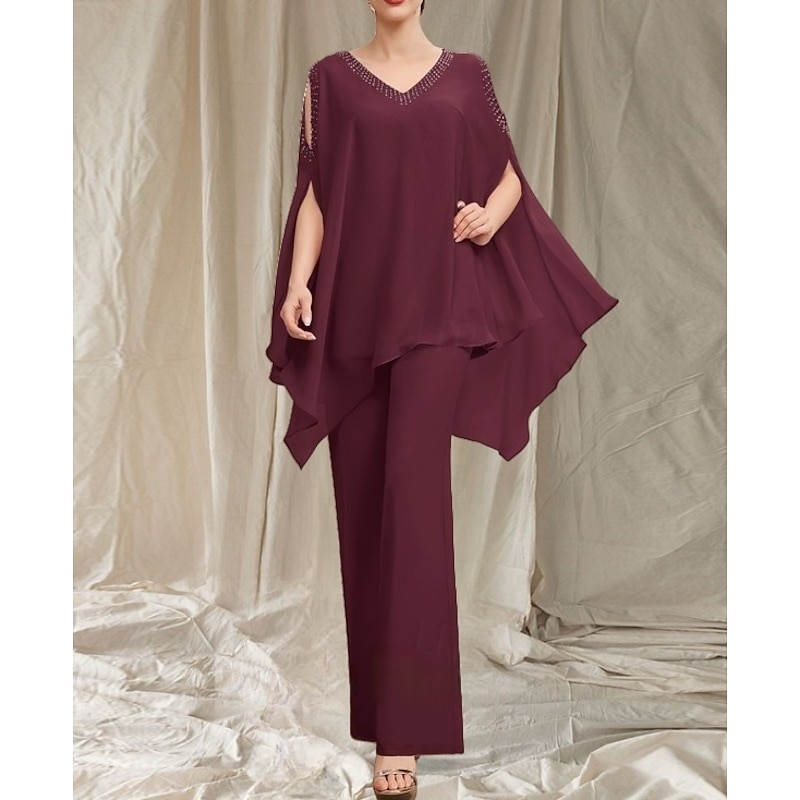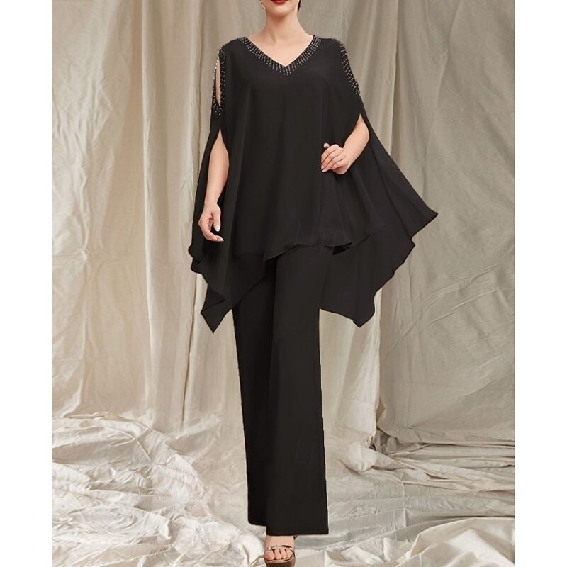 Pantsuit Mother of the Bride Dress Wedding Guest Elegant V Neck Floor Length Chiffon Long Sleeve with Beading Cascading Ruffles 1