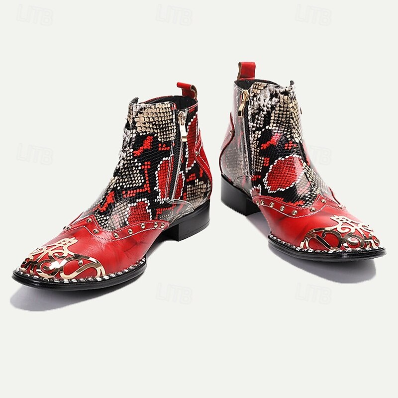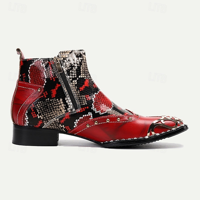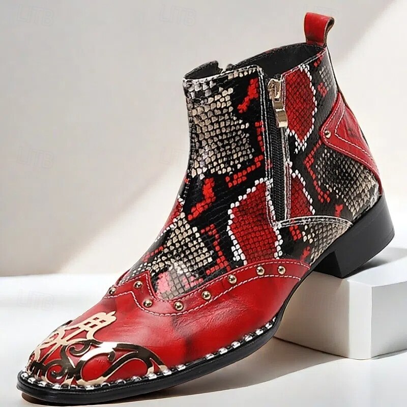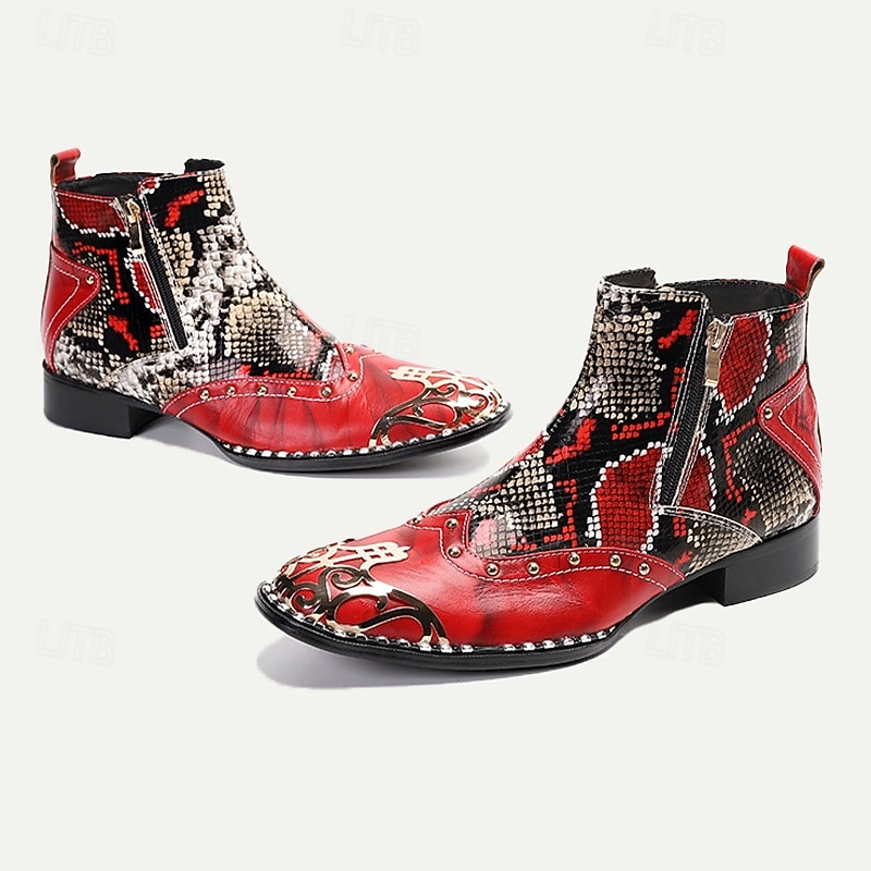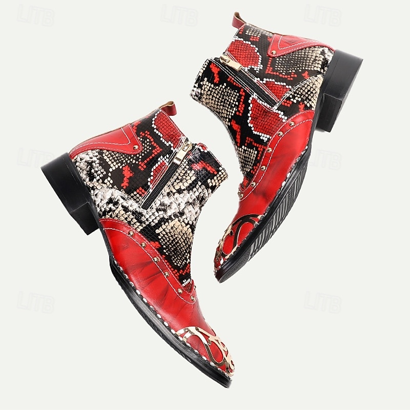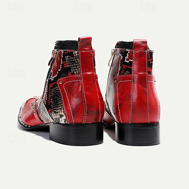 Highlights [Fabric] These men's ankle boots are crafted from premium 100% cowhide leather, featuring an exquisite snakeskin pattern blending bold red and black hues for an outstanding look and luxurious feel. [Fit] Designed for both aesthetics and comfort, the boots offer a stylish yet practical round toe shape, combined with a side zipper that ensures easy on-and-off wear and a secure fit. [Design Highlights] The boots stand out with their metallic toe cap and decorative rivet embellishments, bringing an edgy, sophisticated flair to your wardrobe. The rubber outsole provides slip resistance, ensuring confidence with every step. [Occasions] Ideal for both casual and formal events, these boots are perfect for adding a bold statement to your look during fall and winter seasons. Whether it's a night out or a day in the city, these boots combine style and function seamlessly. [Size Notice] Available in sizes ranging from US6 (EU39, UK5) to US13 (EU46, UK12), making them accessible for a wide range of foot sizes and providing a suitable fit for different preferences.