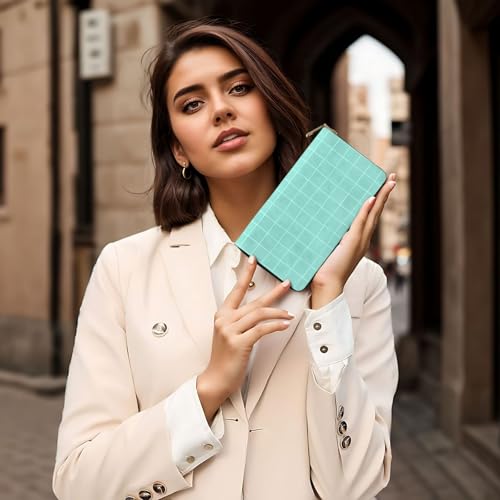Mint Green Hand Drawn Grid Print Wallet Women Men, Long PU Leather Wallets for Women, Cute Womens Travel Wallet Purse Pouch with Zipper Pocket 5