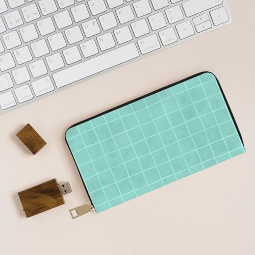 HOT ! Mint Green Hand Drawn Grid Print Wallet Women Men, Long PU Leather Wallets for Women, Cute Womens Travel Wallet Purse Pouch with Zipper Pocket