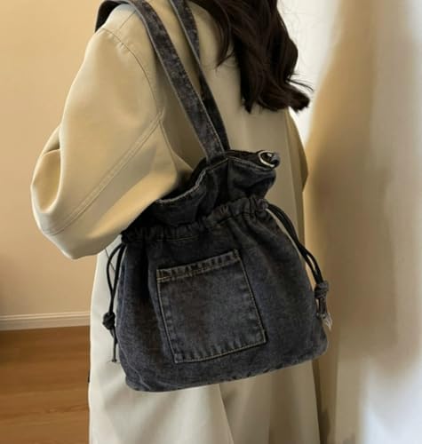 Women's Denim Canvas Tote Bucket Bag Drawstring Crossbody Shoulder Purse Vintage Shoulder Handbag Commute Travel Bag 5