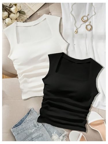HOT ! OYOANGLE Girl's 2 Pack Tank Top Set Knit Square Neck Sleeveless Ruched Fitted Tops
