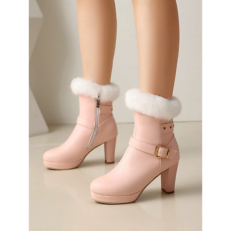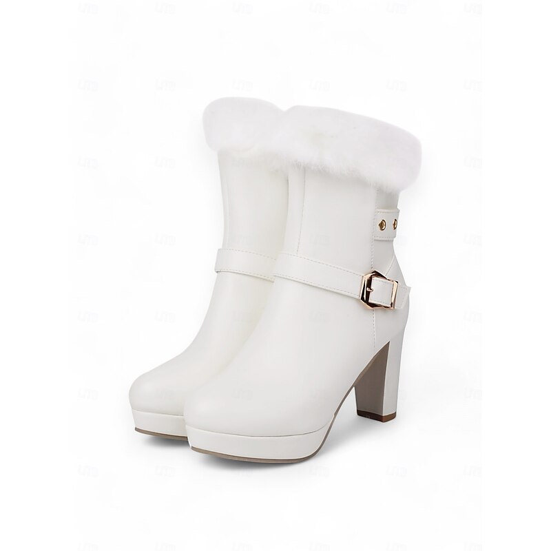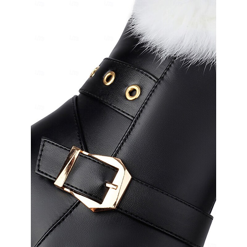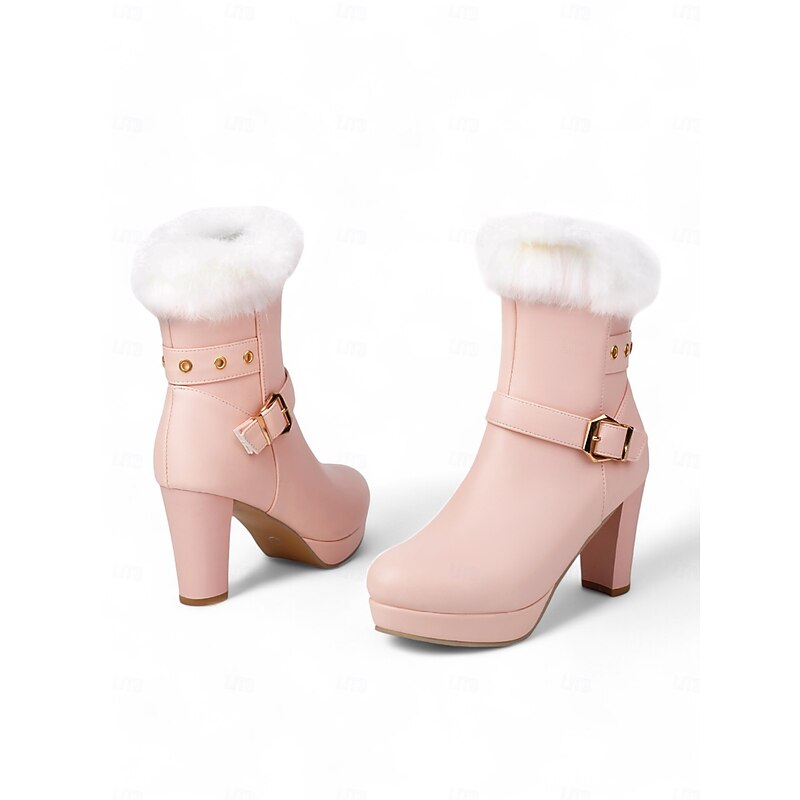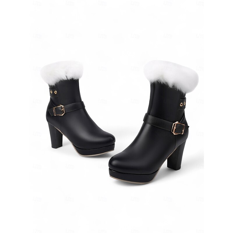 These ankle boots are defined by their stylish buckle embellishment and plush faux fur cuff, which introduces a touch of elegance to the overall look. The convenient inner side zipper promises easy wearability, while the high block heel elevates the silhouette, ensuring both style and functionality.