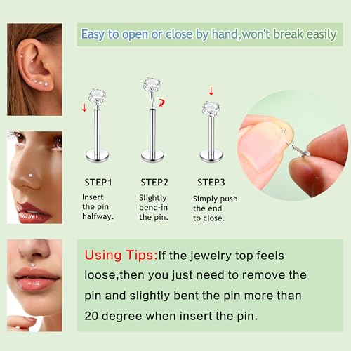 • 【Multifunction Piercings Jewelry】The body piercing jewelry can be used on a variety of piercing parts. They can be 14k gold earrings for women, cartilage earrings for women, nose rings studs, tragus piercing jewelry, helix piercing jewelry, medusa piercing jewelry, labret piercing jewelry, nostril piercing jewelry, conch piercing jewelry, lip ring etc.