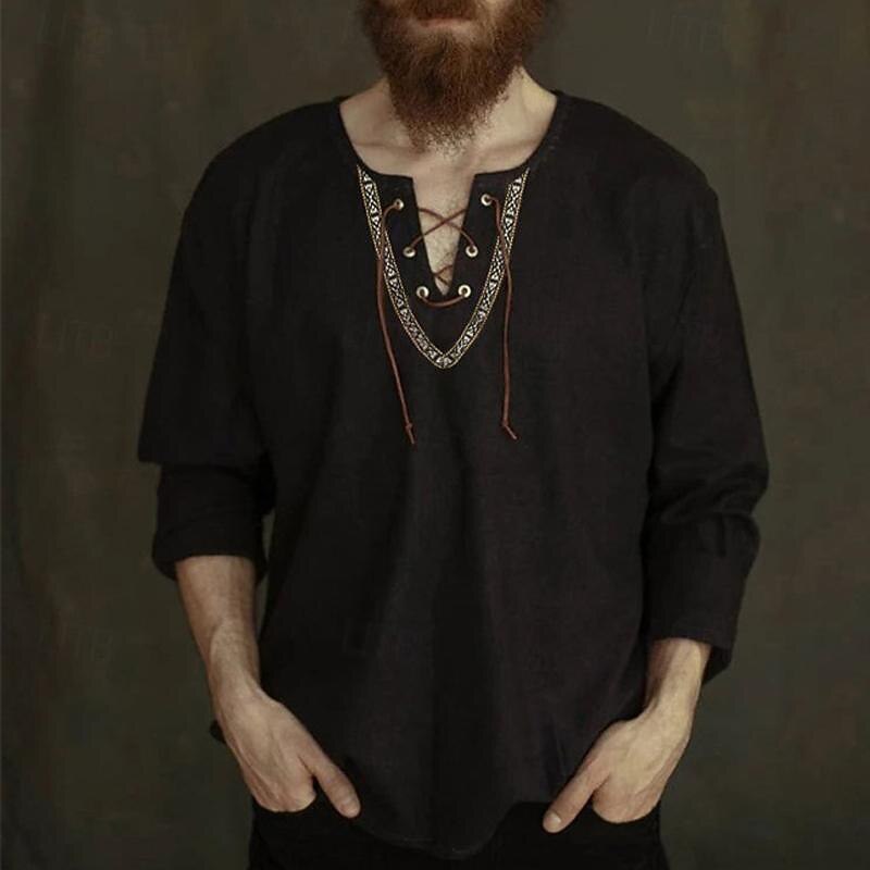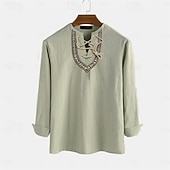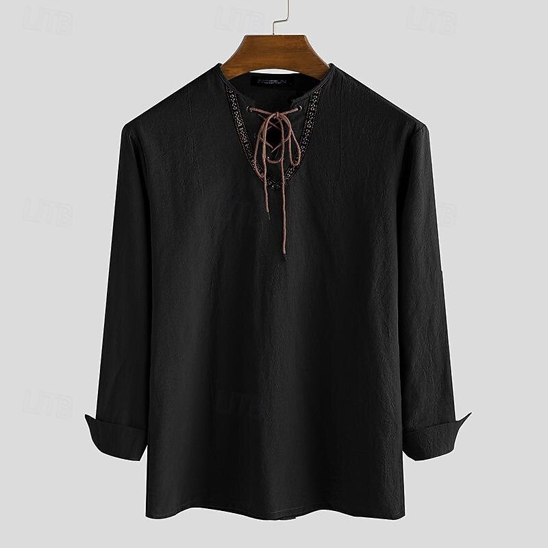 Highlights [Fabric] : Crafted from 100% cotton, this men’s shirt offers the perfect blend of breathability and comfort, making it an ideal choice for warm summer days. [Fit] : The shirt is designed with a relaxed fit that allows for easy movement, ensuring comfort throughout the day. The design features pale, earthy tones that add a touch of sophistication and versatility, suitable for a variety of occasions. [Design Highlights] : This casual shirt features a distinctive lace-up V-neckline adorned with intricate embroidery, adding a unique style that sets it apart. The adjustable lacing not only enhances its aesthetic appeal but also offers functionality. The long sleeves can be easily rolled up, reinforcing its casual and adaptable nature. [Occasions] : Ideal for vacations, holiday events, daily wear, or casual outings, this shirt is versatile enough to fit into a wide range of settings, including streetwear and Hawaiian-inspired gatherings. [Size Range] : Available in a broad range of sizes from S to 3XL, this shirt ensures a comfortable fit for various body types, making it a timeless and essential addition to any wardrobe.