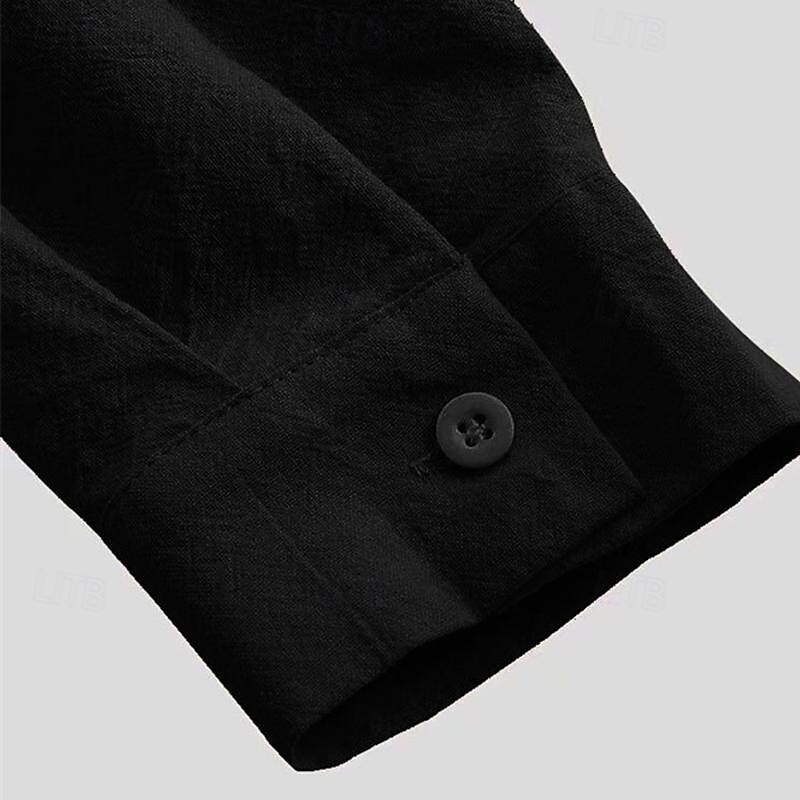 Men's Shirt Cotton Linen Shirt Casual Shirt Plain Casual Daily Black Camel Long Sleeve V Neck Summer Clothing Apparel Lace up 5