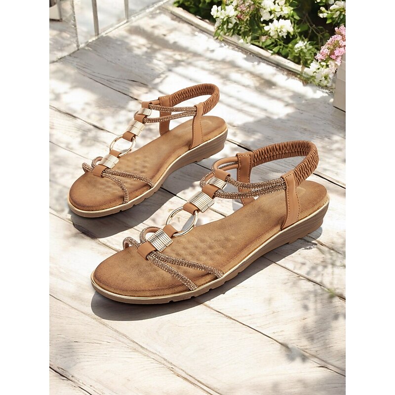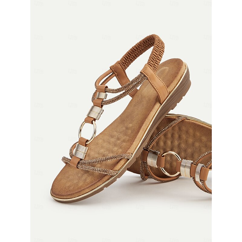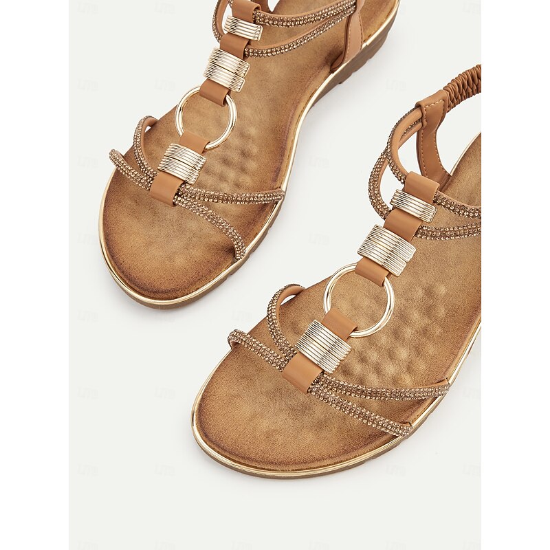 HOT ! Women's Tan Gladiator Flat Sandals with Gold Circle Accents and Rhinestone Detailing, Bohemian Style, Perfect for Casual Summer Outings and Beachwear