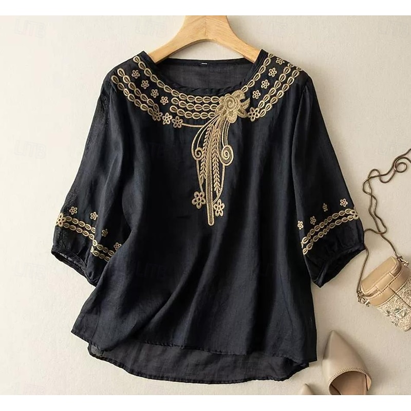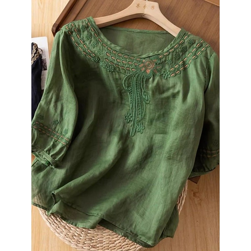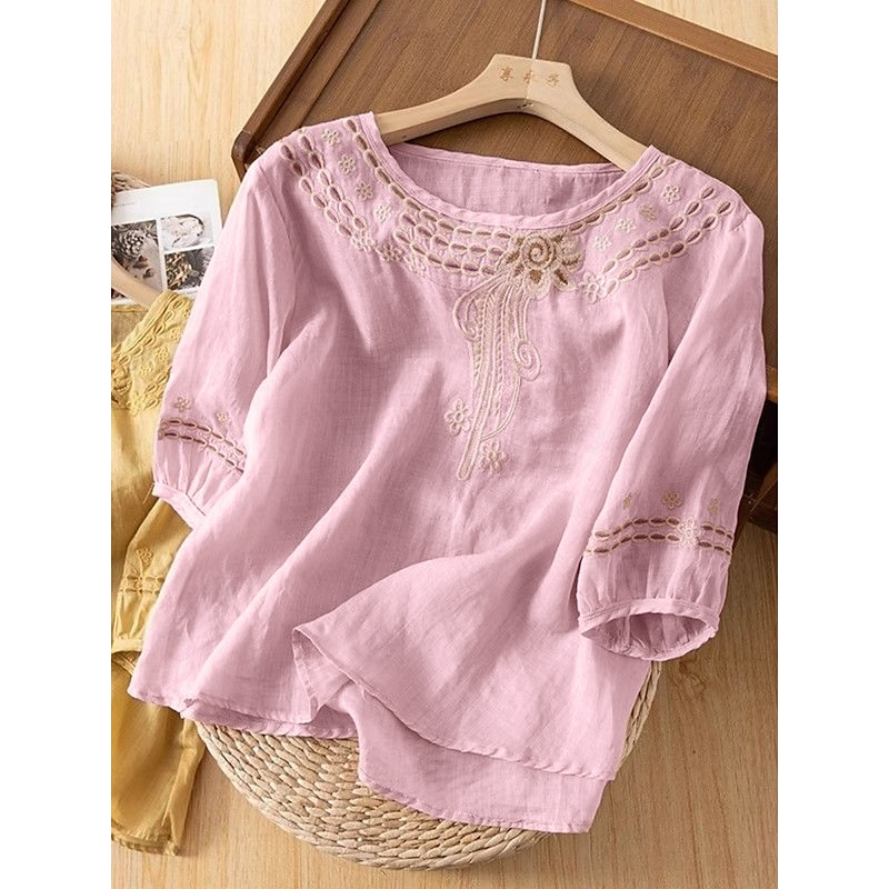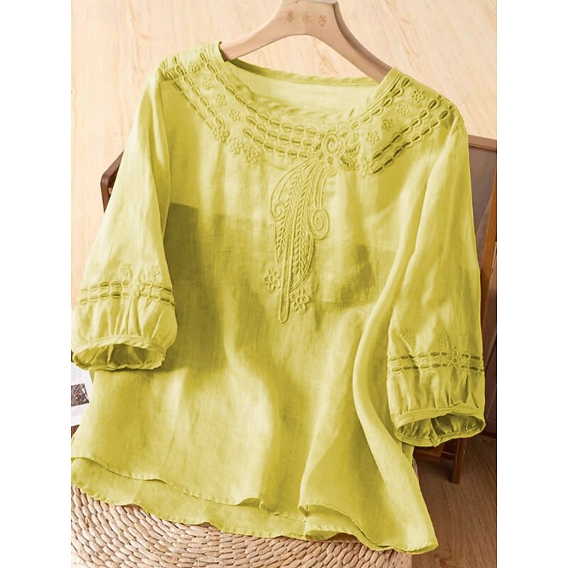 More information about Women's Shirt Cotton Linen Shirts Blouse Solid Color Basic Casual 3/4 Length Sleeve Crew Neck Regular Tops Daily Lace Patchwork Black Yellow Pink Green Summer