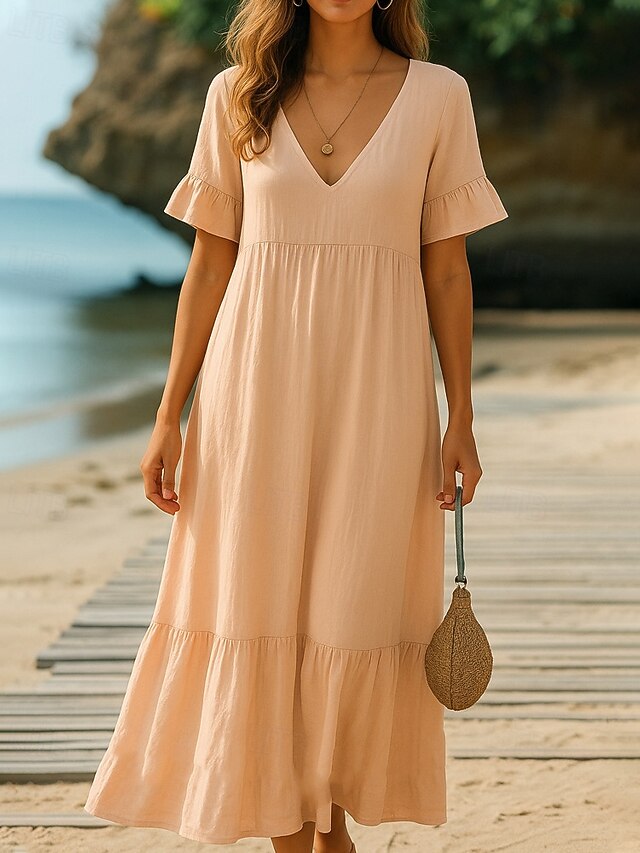 Highlights - Embrace the cozy vibes of Fall with this cotton midi dress - Short sleeves for comfort and style - Unique ruched and ruffle design details - Flattering V-neck neckline - Perfect for women looking for a versatile and chic fall wardrobe piece