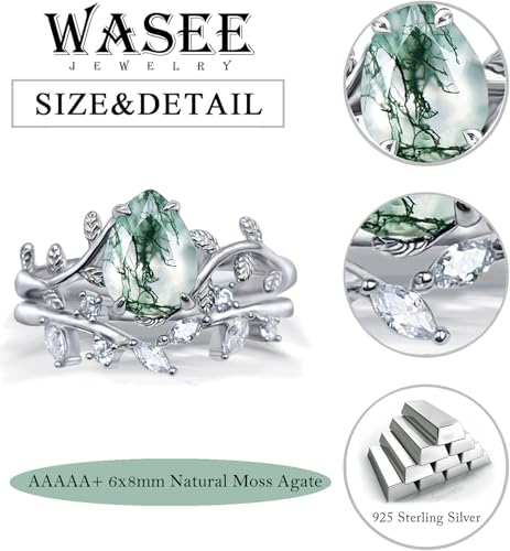 More information about Wasee Natural Moss Agate Ring Set 925 Sterling Silver Green Moss Agate Engagement Ring Leaf Wedding Promise Ring Jewelry for Women,Ring Size 6