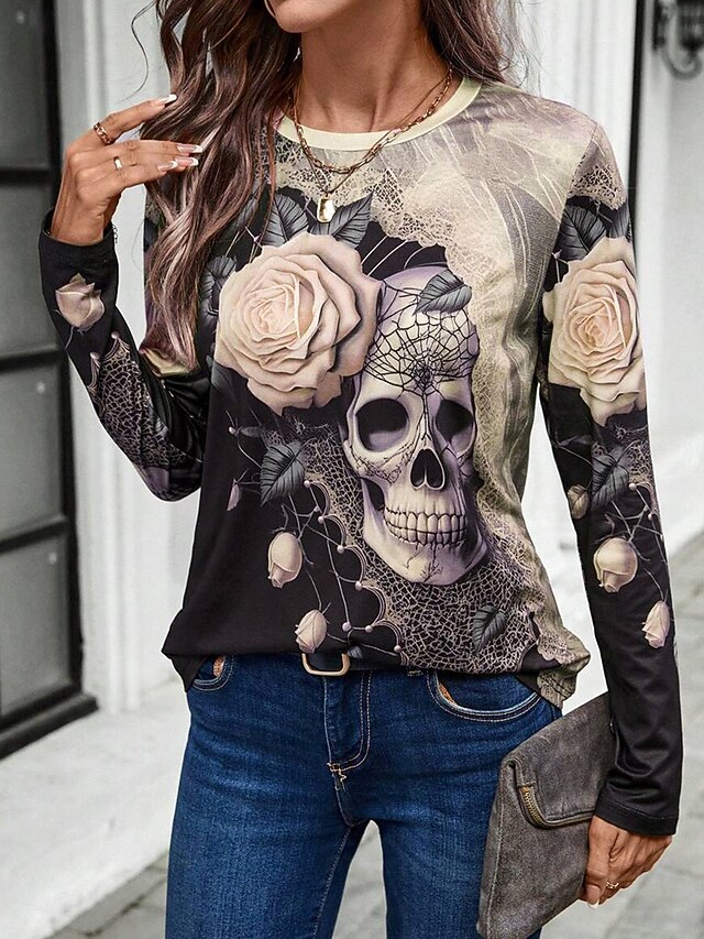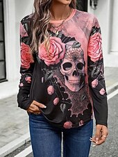 More information about Halloween Women's T Shirt Skulls Long Sleeve Crew Neck Long Sleeve Tunic Floral Graphic Vintage Stylish Classic Round Neck Regular Tops Daily Print Pink Khaki Fall Winter Prefall