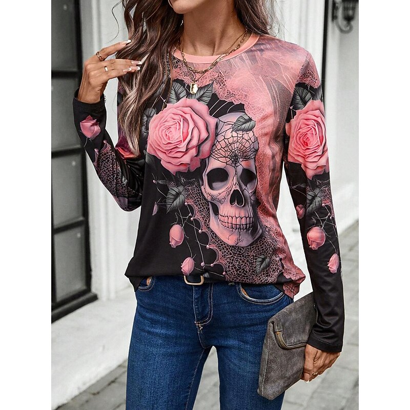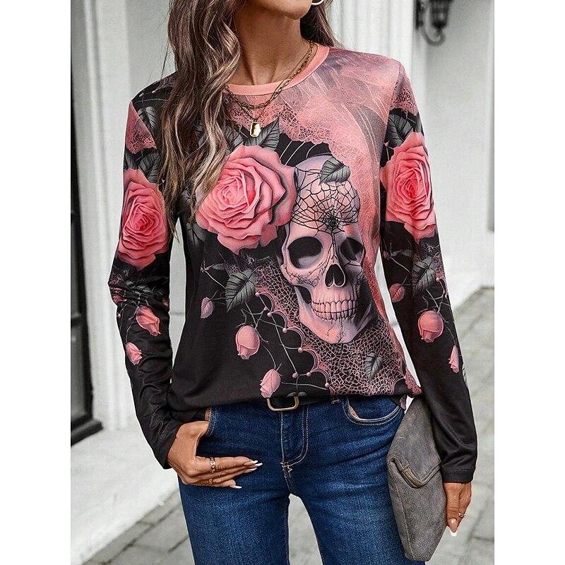 HOT ! Halloween Women's T Shirt Skulls Long Sleeve Crew Neck Long Sleeve Tunic Floral Graphic Vintage Stylish Classic Round Neck Regular Tops Daily Print Pink Khaki Fall Winter Prefall