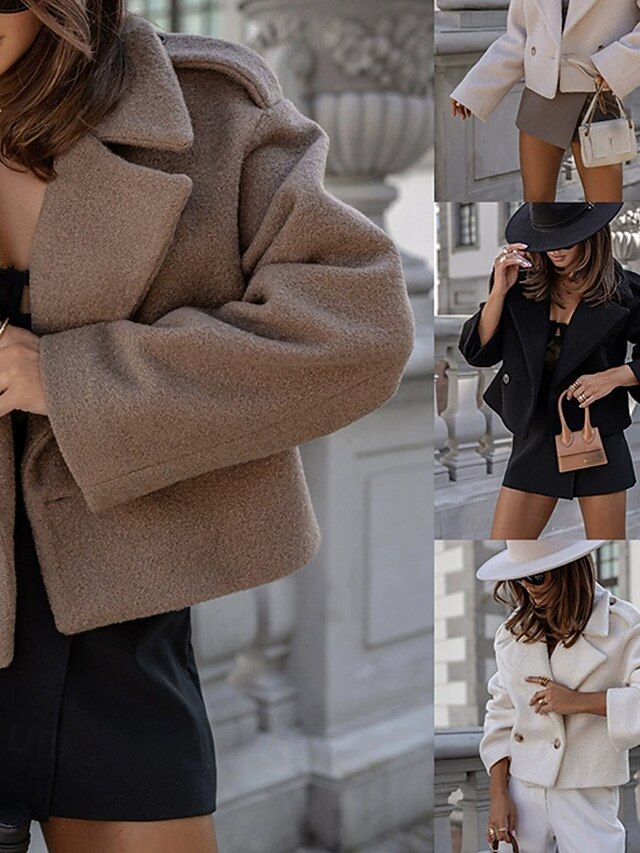 Women's Casual Jacket Warm Comfortable Pocket Buttons Fashion Outdoor Plain Going out Weekend Single Breasted Regular Lapel Regular Fit Long Sleeve Outerwear Black White Apricot Fall Winter 11