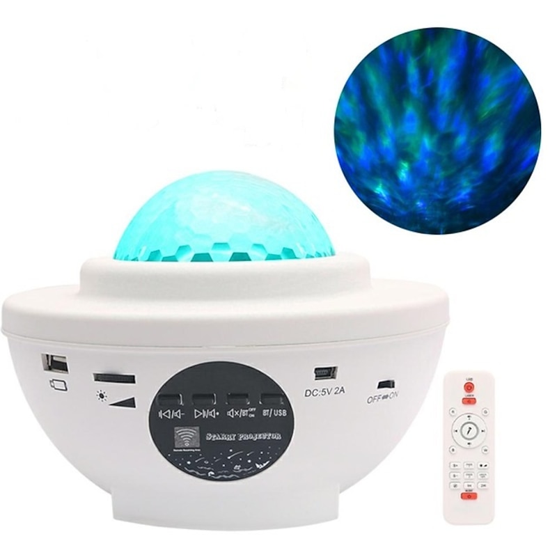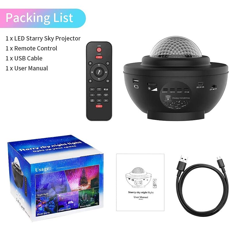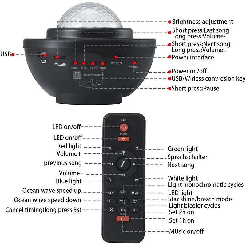 Highlights Product Selling Points: 1. Convenient remote control with sensitive and easy to use keys, powered by 2xAAA batteries. 2. The product offers a unique combination of 10 color water mark lamp and a green laser with multiple control options. Choose from four water mark colors, adjust the water mark mode and speed, control brightness, music and sound, with the added option of Bluetooth connectivity. All devices can connect effortlessly without checking. 3. The lamp body doubles as a music player with options to connect to a U disk or card reader. Users can easily adjust brightness, volume, skip and pause tracks, and even switch to Bluetooth mode, all powered by easy-to-use USB Android power supply.