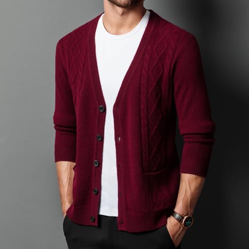 HOT ! Mens Twisted Knit Cardigan Sweater 100% Wool V Neck Casual Button Down Sweaters Long Sleeve Fall Outwear with Pockets