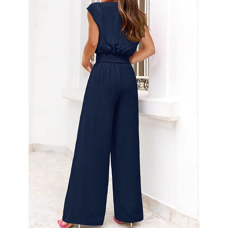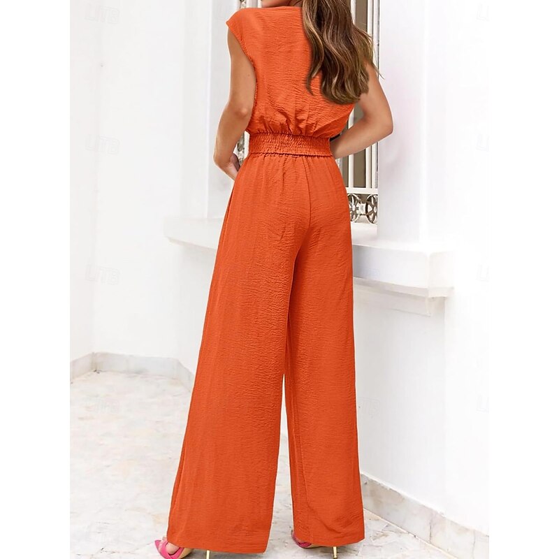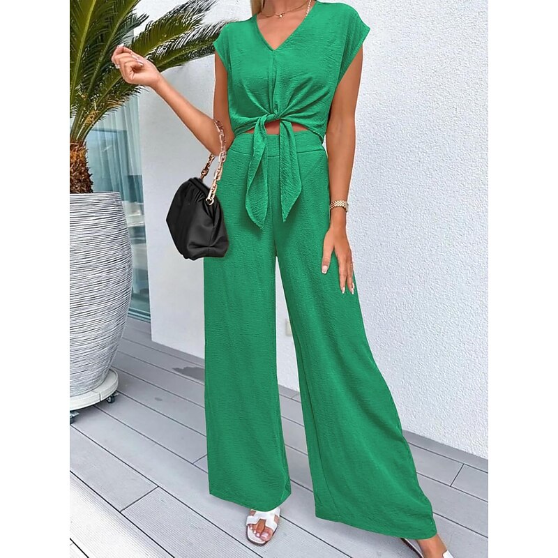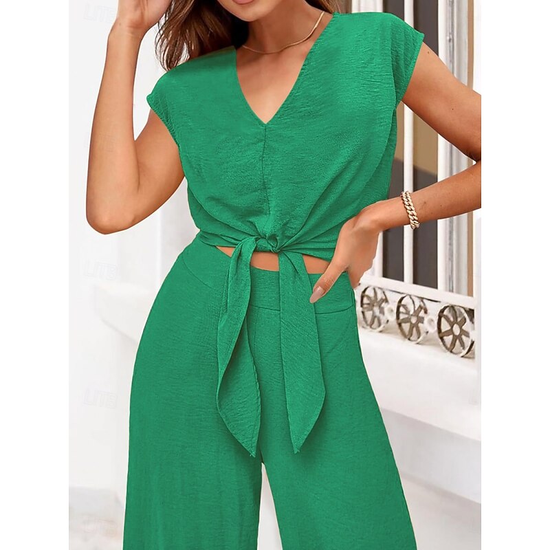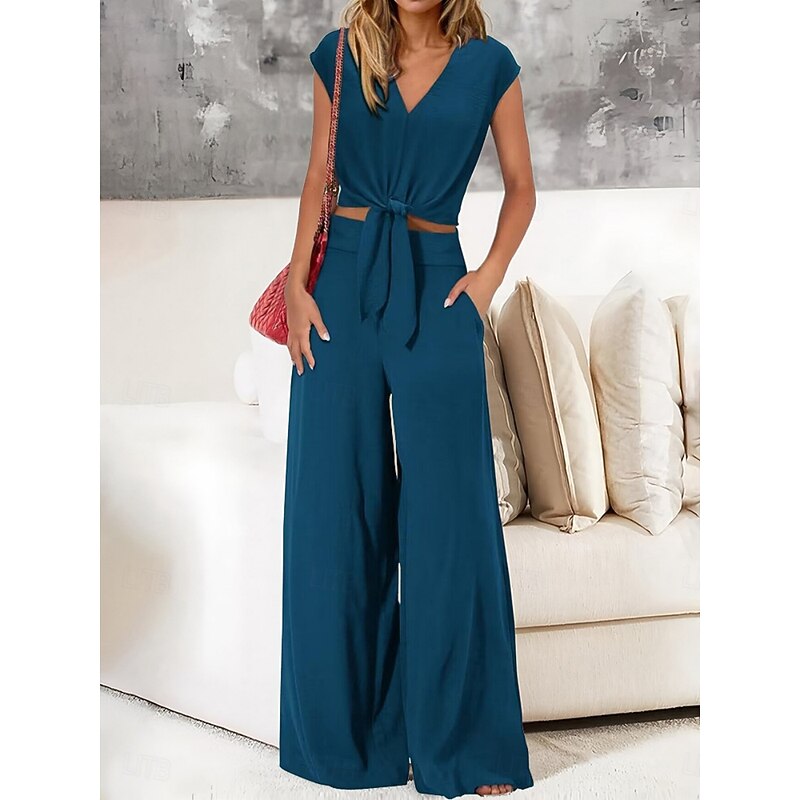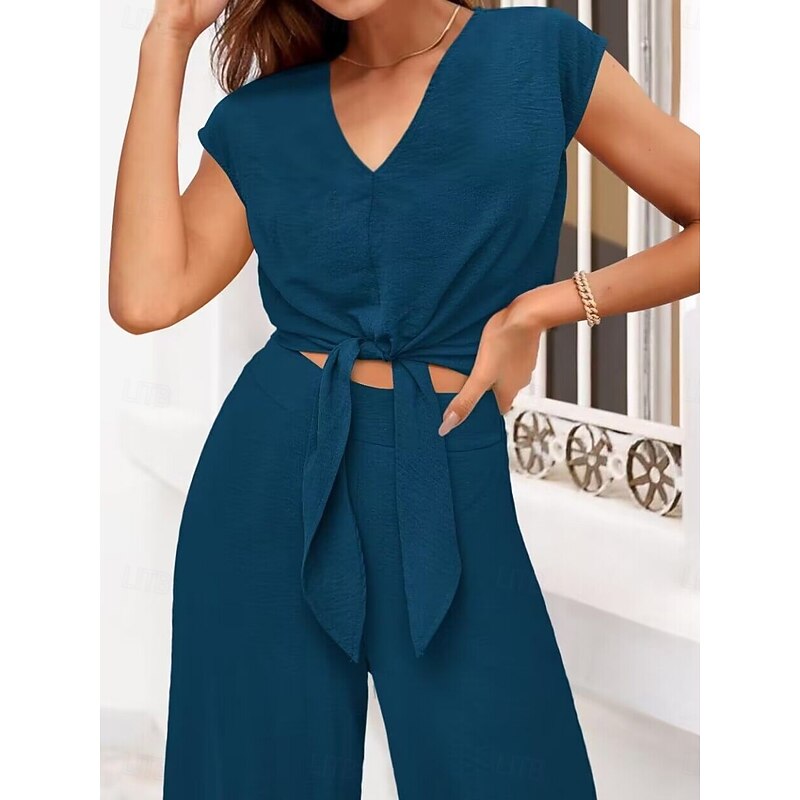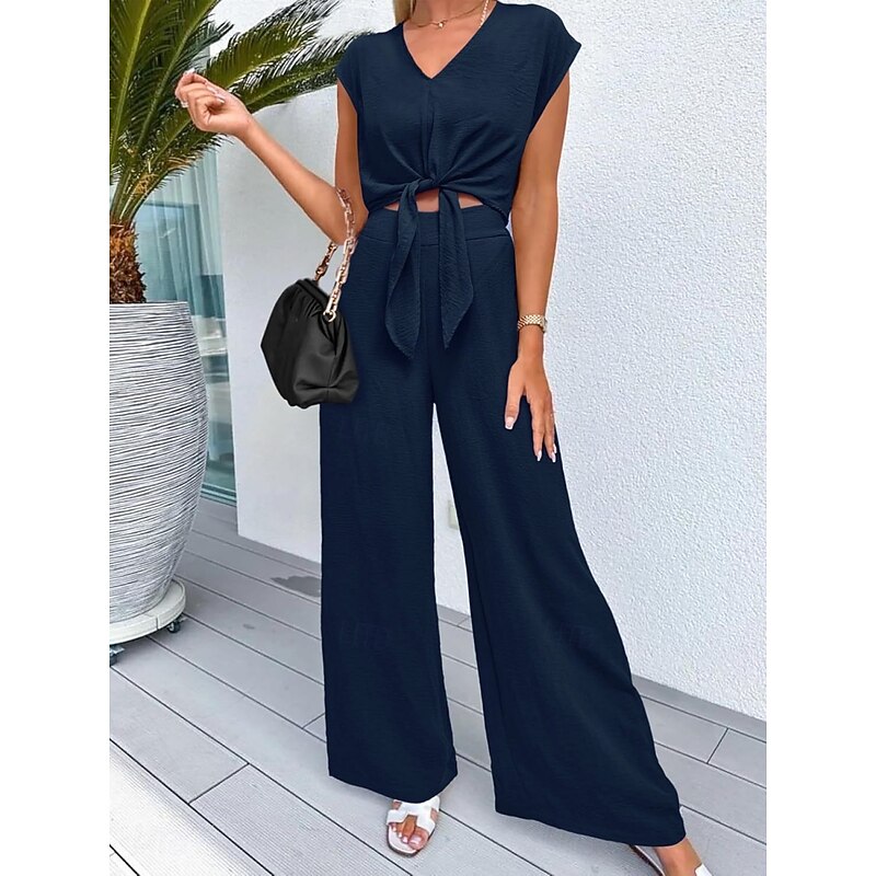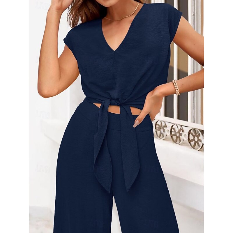 More information about Women's Fashion Streetwear Daily Pants Sets Short Sleeve V Neck Solid Color Lace up Casual Daily Black Dark Navy Navy Blue Summer Regular Fit