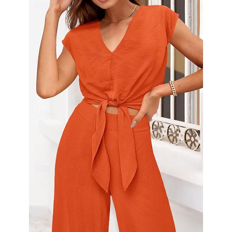 Women's Fashion Streetwear Daily Pants Sets Short Sleeve V Neck Solid Color Lace up Casual Daily Black Dark Navy Navy Blue Summer Regular Fit 21
