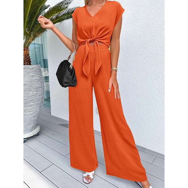 Women's Fashion Streetwear Daily Pants Sets Short Sleeve V Neck Solid Color Lace up Casual Daily Black Dark Navy Navy Blue Summer Regular Fit 28