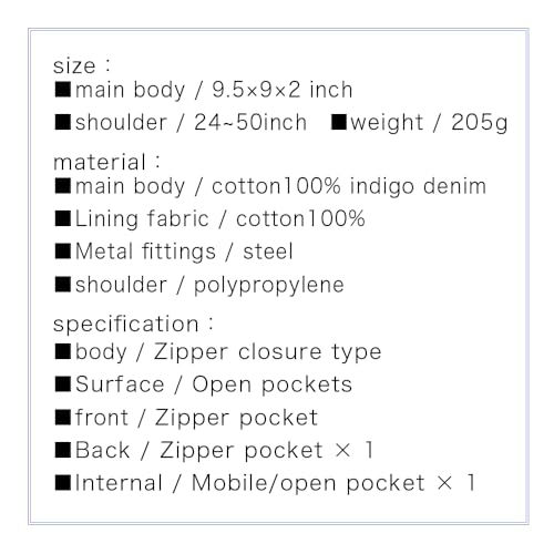 • [Simple design allows for more occasions to use] The simple colors and patterns match any outfit and can be used regardless of age or location, making it perfect as a gift for Mother's Day, Respect for the Aged Day, or birthdays. This is a shoulder bag that is easy and convenient to carry. Material: [Body surface] 100% cotton Okayama denim [Lining fabric] 100% cotton [Shoulder] Polypropylene [Adjustment hardware] Steel