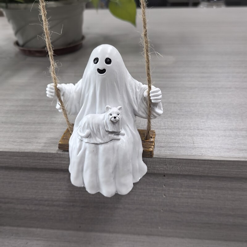 HOT ! Ghost and Dog Swinging Resin Ornament 2025 Halloween Yard Decoration Spooky Swinging Ghost and Dog Statue